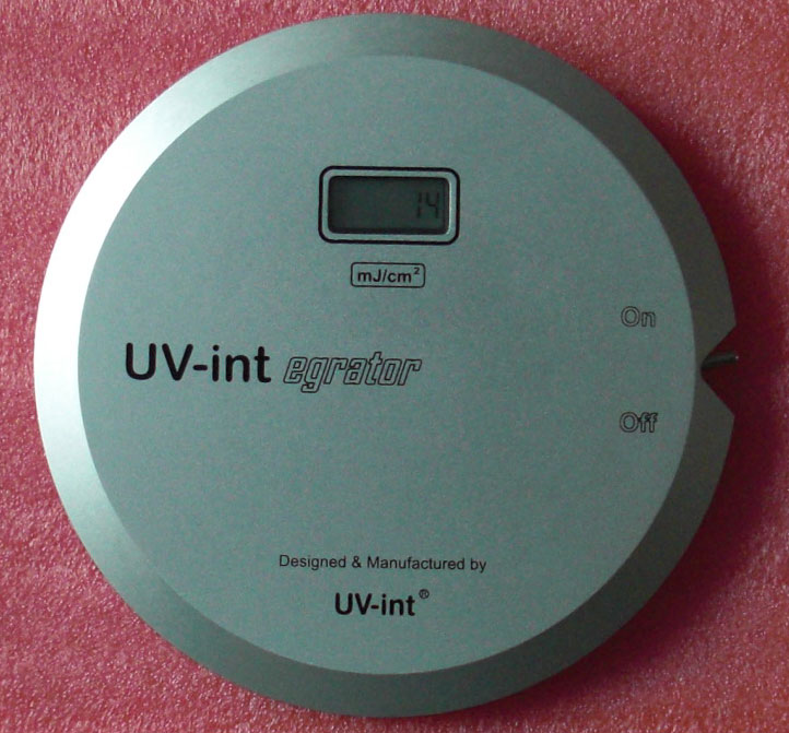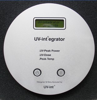 UV能量計( UV-int150+ ): UV-int150+耐高溫UV能量計是一種高質(zhì)量的UV能量測量儀。UV能量計是用于測量UV固化裝置的UV能量的一種儀器,測量儀的主感器在測量儀的背面,測量范圍為250~410納米,測量時可直接顯示于能量計正面的顯示屏上讀出(單位:毫焦耳/平方厘米),該能量計的電源為3.6伏特殊耐高溫125度電池,該電池由于使用了特別的能源節(jié)省線路,該電池可持續(xù)大約5000小時。
